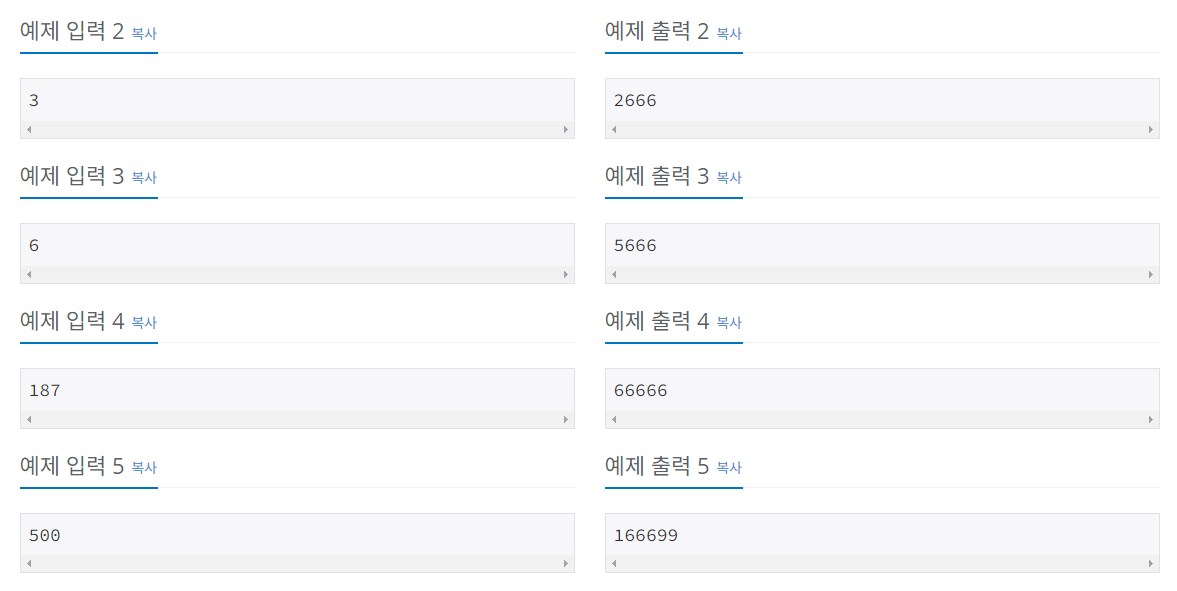 666이 포함되어있으면 cnt값을 증가시키고, 증가된 cnt 값이 N과 같으면 num++된 값을 출력한다.