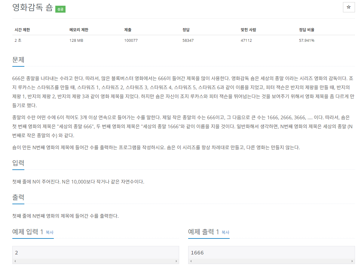 666이 포함되어있으면 cnt값을 증가시키고, 증가된 cnt 값이 N과 같으면 num++된 값을 출력한다.