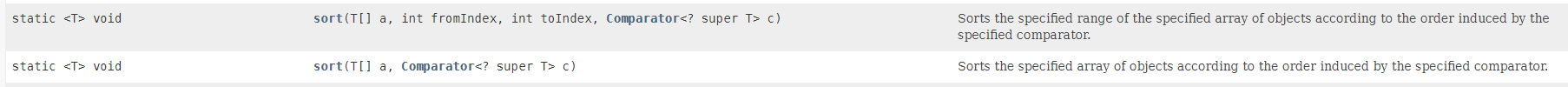 위는 시작 인덱스와 끝 인덱스 사이를 사용자가 지정한 Comparator 에 따라 정렬해줄 수 있고, 아래는 전체 배열을 사용자가 지정한 Comparator에 따라 정렬해준다.