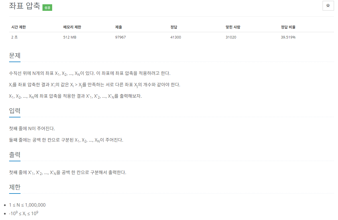 https://www.acmicpc.net/problem/18870 18870번: 좌표 압축 수직선 위에 N개의 좌표 X1, X2, ..., XN이 있다. 이 좌표에 좌표 압축을 적용하려고 한다. Xi를 좌표 압축한 결과 X'i의 값은 Xi > Xj를 만족하는 서로 다
