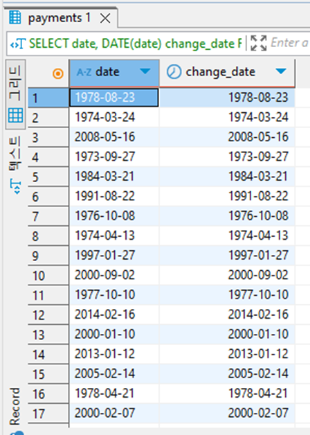 기존에 varchar 타입이었는데 change_date에서는 Date 타입으로 바뀌었음.