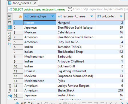 1) 음식 타입별, 음식점별 주문 건수 집계하기
