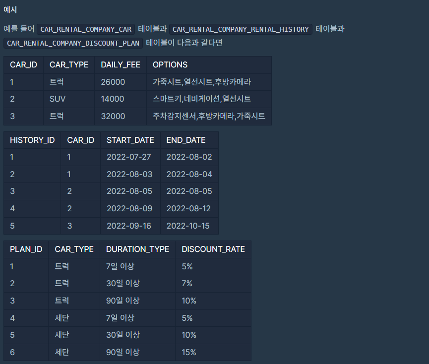 3. 조건 확인을 위해 CAR_TYPE=”트럭” 인 경우의 테이블 전체 조회.