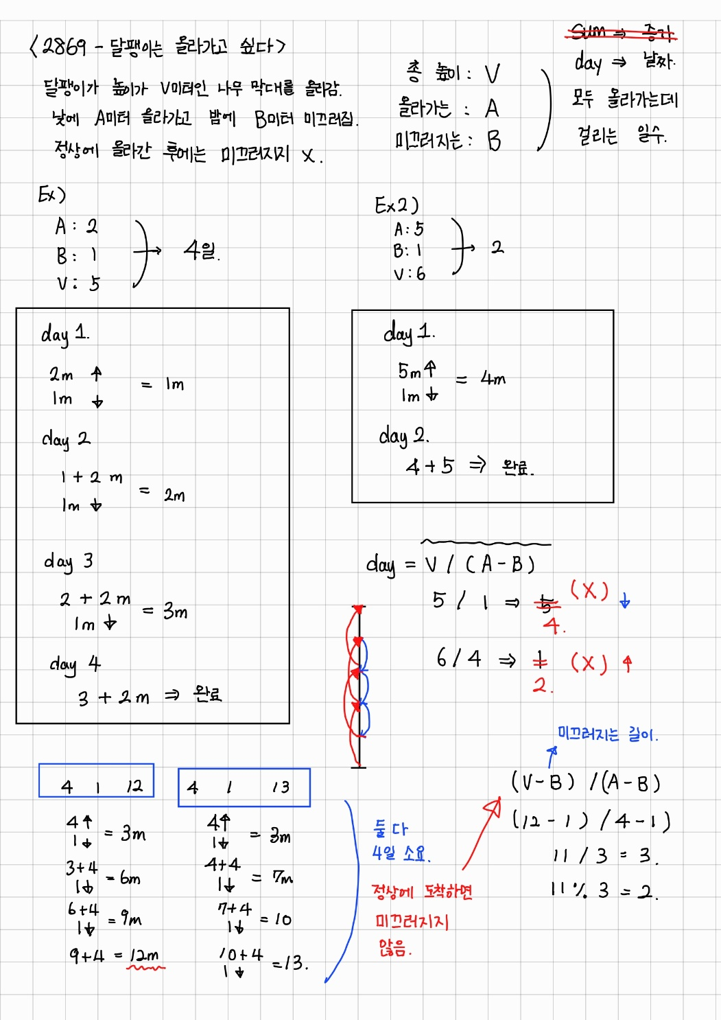 다른 반례들을 보려고 스스로 임의의 값을 정해서 풀어봤더니 정상에 도착하면 미끄러지지 않는다는 조건 때문에 그런 거였다. 그래서 (V - B) / (A - B)를 해주고, (V - B) % (A - B) != 0 일 경우에 day++를 해주는 방식으로 문제를 해결하였다.
